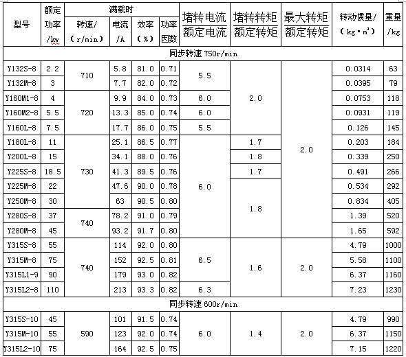 Y系列(IP44)三相異步電動機主要技術參數(shù)(同步轉速750r/min)