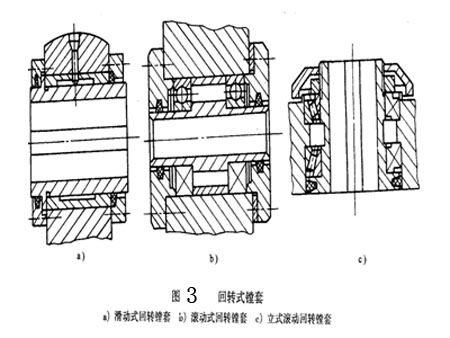 圖3為滑動(dòng)式回轉(zhuǎn)鏜套,其結(jié)構(gòu)尺寸較小,回轉(zhuǎn)精度高,減振性好,承載能力大,但需要充分潤滑,摩擦面的線速度不能大于0.3-0.4m/s,常用于精加工。圖3b為滾動(dòng)式回轉(zhuǎn)鏜套,用于臥式鏜孔,由于鏜套與支架之間安裝了滾動(dòng)軸承,所以回轉(zhuǎn)線速度可大大提高,一般u>0.4m/s,但是徑向尺寸較大,回轉(zhuǎn)精度受軸承精度影響。圖3c為立式鏜孔用的回轉(zhuǎn)式鏜套。它的工作條件差,受切液和切屑的沖刷,一般設(shè)有防屑結(jié)構(gòu),并采用圓錐滾子軸承。