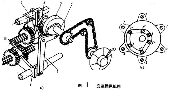 軸Ⅱ上雙聯(lián)齒輪和軸Ⅲ上的三聯(lián)齒輪是用一個手柄同時操縱的。變速手柄裝在主軸箱的前壁面,手柄通過鏈傳動使國4轉(zhuǎn)動,在軸4上固定有盤形凸輪3和曲柄2.凸輪3上有一條封閉的曲線槽,它由兩段同半徑的圓弧和直線所組成。凸輪上有6個不同的變速置,(如圖中以a-f標出的位置)。凸輪曲線槽通過杠桿5操縱軸Ⅱ上的雙聯(lián)滑動齒輪。當杠桿的滾子心處于凸輪曲線槽的大半徑處時,皮時齒輪在左端位置;若處于小半徑處時,則移到右端位置。 曲柄2上的圓銷的伸出端套有滾子,嵌在拔叉1的長槽中。當機柄2隨著軸4轉(zhuǎn)動時,可帶動撥動軸Ⅲ的滑動齒輪,使它處于左、中、右三種不同的位置。順次地轉(zhuǎn)動手柄至各個變速位置,就可使兩個滑動齒輪塊的軸向位置實現(xiàn)6種不同的組合,從面使軸Ⅲ得到6種不同的轉(zhuǎn)速;讫X輪聲色移至規(guī)定的位置后,采用鋼球定位裝置進行了可靠的定位。