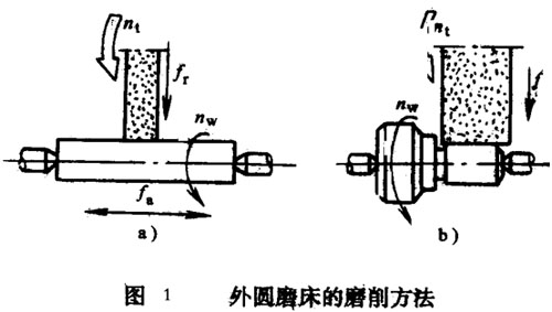 用中心磨床磨削外圓柱面時(shí),基本的磨削方法有兩種:縱磨法和切入磨法。見圖1。