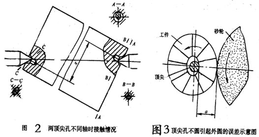 (2)兩端頂類孔的同軸度誤差 兩端頂尖孔沒軸,造成頂尖與頂尖孔接觸不良的情況,加工時(shí)出現(xiàn)圓度及位置誤差。圖2所示兩端頂尖孔因兩端不同軸形成接觸不良的情況。