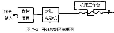 1)開環(huán)控制數(shù)控機(jī)床,在開環(huán)控制中,機(jī)床沒有檢測(cè)反饋裝置(見圖7-3),數(shù)控裝置發(fā)出信號(hào)的流程是單向的,它對(duì)機(jī)床移動(dòng)部件的實(shí)際位置不作檢驗(yàn),加工精度主要取決于伺服系統(tǒng)的性能。這種機(jī)床工作比較穩(wěn)定,反映迅速。調(diào)試方便,維修簡(jiǎn)單,但其控制精度受到限制。