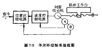 3)半閉環(huán)控制數(shù)控機(jī)床,這種控制方式對(duì)工作臺(tái)的實(shí)際位置不進(jìn)行檢查測(cè)量,而是通過與伺服電動(dòng)機(jī)有聯(lián)系的測(cè)量元件,如測(cè)速發(fā)電機(jī)A和光電編碼盤B(或旋轉(zhuǎn)變壓器)等間接檢測(cè)出伺服電動(dòng)機(jī)的轉(zhuǎn)角,推算出工作臺(tái)的實(shí)際位移梁,并與指令值進(jìn)行比較,用差值來實(shí)現(xiàn)控制(圖7-5)。這種控制方式工作臺(tái)沒有完全包括在控制回路內(nèi),精度沒有閉環(huán)高,調(diào)試卻比閉環(huán)方便。