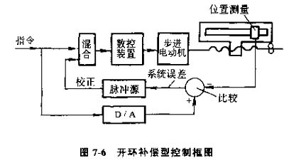 4)開換補(bǔ)償型數(shù)控機(jī)床,將上述三種控制方式的特點(diǎn)有選擇地集中起來,可以組成混合控制的方案。大型數(shù)控機(jī)床,需要高得多的進(jìn)給速度和返回速度,又需要相當(dāng)高的精度。如果只采用全封閉的控制,機(jī)床傳動(dòng)鏈和工作臺(tái)全部置于控制環(huán)節(jié)中,安裝調(diào)試十分復(fù)雜,為了避免這些矛盾,可以采用混合控制方式。圖7-6為開環(huán)補(bǔ)償方式的組成框圖。它的特點(diǎn)是:基本控制選用步進(jìn)電動(dòng)機(jī)的開環(huán)控制伺服機(jī)構(gòu),附加一個(gè)校正伺服電路。通過裝在工作臺(tái)上的直線位移測(cè)量元件的反饋信號(hào)來校正機(jī)械系統(tǒng)的誤差