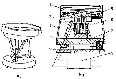 (1) 振動(dòng)式料斗的運(yùn)動(dòng)特點(diǎn)圖60-1的振動(dòng)式料斗由電磁力作為驅(qū)動(dòng)力。當(dāng)電磁達(dá)到最大值時(shí),街鐵9被吸下,帶動(dòng)料斗1,同時(shí)三片沿圓周方向分布的彈簧2變形。電磁力消失時(shí)街鐵放開(kāi),彈簧復(fù)原。彈簧的變形,復(fù)原過(guò)程中,料斗1既作上下運(yùn)動(dòng),又作扭轉(zhuǎn)運(yùn)動(dòng),使零件從低部沿螺旋軌道上升,在料斗內(nèi)座上布置的定向裝置對(duì)零件作定向整理。正確定向的零件從料斗上部的出料口進(jìn)入輸聊管道。