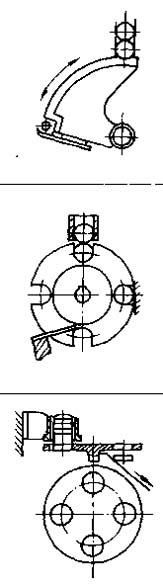帶溝槽的圓盤間歇轉(zhuǎn)動(dòng),當(dāng)盤回轉(zhuǎn)時(shí),零件輪流入盤上的凹槽中,在隨這盤的轉(zhuǎn)動(dòng)進(jìn)入工作區(qū) |