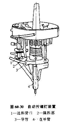 (1)導(dǎo)管式螺釘自動(dòng)裝配工作頭,這種工作頭通過導(dǎo)管來引導(dǎo)已定向的螺釘按正確的姿態(tài)進(jìn)入裝配位置。圖60-30為一種擰緊器與供料裝置為一體的自動(dòng)擰緊螺釘裝置。螺釘在送料管口1處被隔料器2擋住,主軸帶動(dòng)改錐將螺釘擰入工件后,該錐上抬,隔料器2放下一個(gè)螺釘使之沿導(dǎo)管3進(jìn)入直導(dǎo)管4,進(jìn)入新的循環(huán)。
