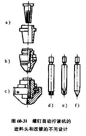 進(jìn)料頭需要根據(jù)螺釘尺寸和螺釘裝配要求設(shè)計(jì)。圖60-31為幾種不同類型的進(jìn)料頭和旋具。圖60-31a中的進(jìn)料頭適用于長(zhǎng)徑比大于5的螺釘,進(jìn)料頭帶有一個(gè)錐形彈性鉗,內(nèi)錐通過主軸上的套筒實(shí)現(xiàn)定心。圖60-31b和圖60-31c適用于短螺釘,這兩種進(jìn)料頭別有鉸鏈?zhǔn)姐Q臂裝在軸上,關(guān)閉時(shí)形成一個(gè)螺釘直徑大小的孔,進(jìn)料時(shí)進(jìn)料頭與孔的上端接觸,在擰人螺釘?shù)倪^程中,鉸鏈臂通過旋具的設(shè)計(jì)可根據(jù)螺釘頭取相應(yīng)的結(jié)構(gòu),如六角形、十字形成或帶槽的旋具。