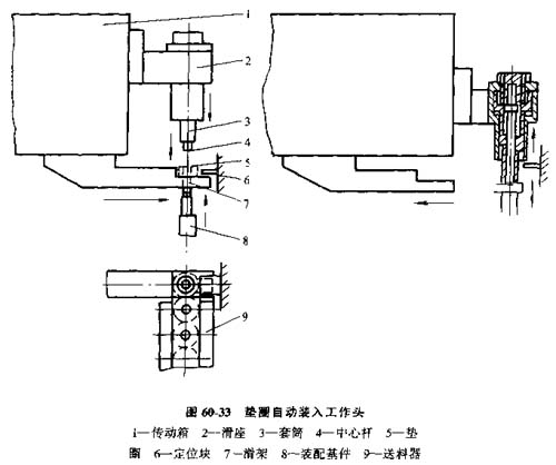 圖60-33為一種墊圈自動裝入工作頭。墊圈5作為裝配由送料器9水平送入,呀靠滑架7和中心桿4定位。隨后滑座2下行,中心桿4插入墊圈孔內(nèi)。同時,裝配基準(zhǔn)件8上升與中心桿4結(jié)合。滑架7隨即退回。然后套筒3下行,用機(jī)動推入方式完成墊圈5與裝配基準(zhǔn)件8的自動裝配作業(yè)。