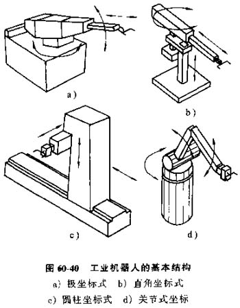機器人的基本結(jié)構(gòu)有四種:直角坐標(biāo)、極坐標(biāo),圓柱坐標(biāo)和關(guān)節(jié)式坐標(biāo),見圖60-40。