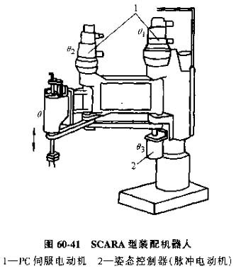 圖60-41為SCARA型機(jī)器人的外姓?qǐng)D,有大臂回轉(zhuǎn),小臂回轉(zhuǎn)、腕部升降及回轉(zhuǎn)等四個(gè)自由度。