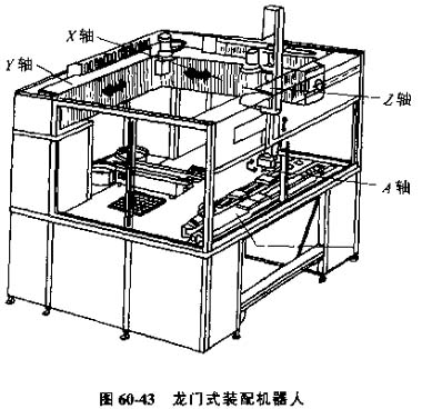 (2)直角坐標(biāo)式裝配機(jī)器人,直角坐標(biāo)式裝配機(jī)器人帶有X、F、Z平移軸,工作范圍的立體空間尺寸取決于各軸的運(yùn)動(dòng)距離。Z軸通常裝有夾爪及附加旋轉(zhuǎn)軸。圖60-43為一種龍門結(jié)構(gòu)的平移軸型裝配機(jī)器人。