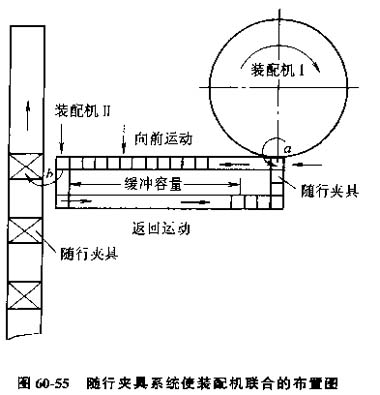圖60-55所示為一臺回轉式裝配機與儀態(tài)直進式裝配機的組合布置。回轉裝配機I上已裝配的組件先送到a位置的隨行夾具上。由氣動裝置將組件從a位置腿到輸送機輸送帶上送到b位置。傳誦帶的長度決定緩沖區(qū)的容量。直進式裝配機Ⅱ上的處理裝置將組件從b位置放到裝配機Ⅱ的隨行夾具中、氣動裝置將空隨行夾具推倒輸送系統(tǒng)的返回輸送帶上,回到a位置。