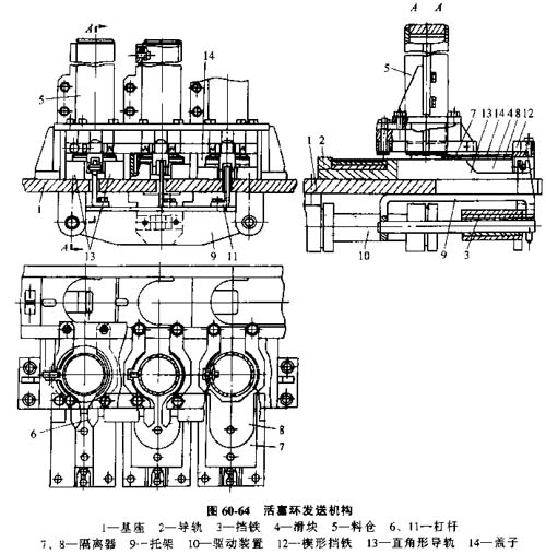 向滑塊上自動(dòng)發(fā)送活塞環(huán)的機(jī)構(gòu),圖60-64機(jī)構(gòu)有一個(gè)基座上緊固著逐個(gè)發(fā)送活塞環(huán)的料倉5和杠桿6,在垂直于料倉中心線的平面內(nèi)鉸接并用彈簧相互拉緊,還帶有形狀與被夾持的活塞環(huán)相似的輥?zhàn)鱼Q口,以及在料倉下垂直其中心線的并在平面內(nèi)能移動(dòng)的隔離器7和8推板做成托架9的形式,并帶有強(qiáng)制性驅(qū)動(dòng)裝置10,推板沿導(dǎo)軌2移動(dòng),用杠桿11與滑塊4相互作用,滑塊上固定隔離器7和8以及楔形擋鐵12,在滑塊工作行程末端與彈簧杠桿6相互作用;瑝K連同不動(dòng)的固定隔離器可以在固定于基座上的直角形導(dǎo)軌13內(nèi)移動(dòng)。隔離器上面用蓋子14蓋住,靜止地架在直角形導(dǎo)軌13上面