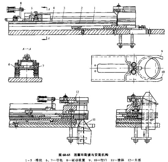 A. 在活塞槽中安裝活塞環(huán)的機(jī)構(gòu),圖60-65機(jī)構(gòu)做成盒子形狀,盒子的壁由滑塊1、2、3、4、5形成,每一個(gè)滑塊帶一套活塞環(huán)中、的一個(gè);瑝K依次安排在導(dǎo)軌6和7上。導(dǎo)軌具有斜角,可將活塞環(huán)壓在安裝基準(zhǔn)中,在起始位置上,這個(gè)些滑塊的端部構(gòu)成了一個(gè)朝向工作區(qū)的臺(tái)階,除最底下的一個(gè)滑塊外,每一個(gè)滑塊都有一塊擋鐵,作為推桿來推動(dòng)其下面的滑塊;上面的滑塊4與往復(fù)運(yùn)動(dòng)驅(qū)動(dòng)裝置8相連。滑塊的端部作成兩鉗口9和10,相互之間為彈性聯(lián)系。在導(dǎo)軌6和7上,滑塊按活塞環(huán)的給定高度配置。從專用的盒狀料倉中通過導(dǎo)軌的縫隙拉出活塞環(huán)。當(dāng)滑塊5運(yùn)動(dòng)時(shí),由于位于滑塊4槽上的擋鐵帶動(dòng)滑塊4,類似地使滑塊3等移動(dòng)。每一滑塊確定的間隙在自己的導(dǎo)軌上移動(dòng)。接著又沿導(dǎo)軌的斜面移動(dòng),滑塊一個(gè)個(gè)地堆積起來。此時(shí),每個(gè)活塞環(huán)以自己的大部分端面支撐在踝塊張開的爪上,并被上面滑塊壓住。