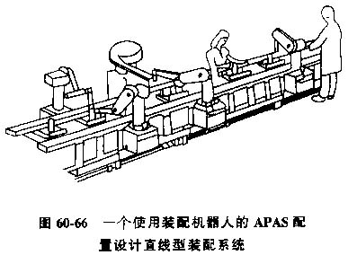 直線型柔性裝配系統(tǒng),圖60-66為一個(gè)適用于批量裝配生產(chǎn)的柔性裝配系統(tǒng),稱為可編程序裝配系統(tǒng)。在該系統(tǒng)中,裝配機(jī)器人是最重要的設(shè)備,不過還需要有傳送零件的輸送帶。機(jī)器人沿直線排列。裝配任務(wù)是在同一個(gè)底座裝配件裝上一個(gè)分裝配件,然后由輸送帶送到下一個(gè)裝配工位并再裝上另一個(gè)分裝配件。如此連續(xù)不斷的依次逐個(gè)裝上分裝配件,直至完成全部裝配工作。這種裝配方式最適合使用機(jī)器人。要求機(jī)器人不僅能完成裝配工作,而且要特殊的技巧或判斷,機(jī)器人不能勝任時(shí),則由人工完成作業(yè)。