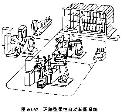 環(huán)路型柔性自動(dòng)裝配系統(tǒng),一種環(huán)路型柔性自動(dòng)裝配系統(tǒng)的基本特點(diǎn)是結(jié)構(gòu)不取決于特定的裝配順序。圖60-67為具有此特點(diǎn)的一個(gè)可裝配各種型號(hào) 的柔性裝配系統(tǒng)。該系統(tǒng)由三個(gè)子系統(tǒng)組成;可編程序裝配單元、系統(tǒng)存貯倉庫、柔性傳動(dòng)系統(tǒng)。除這些子系統(tǒng)外,在裝配系統(tǒng)中還可加入特種功能的專門站,如檢驗(yàn)站、清洗站和壓床等。