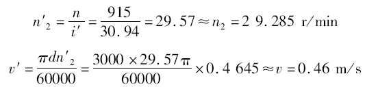 查表A1,選取MQ滿足不等式Mjmax≤MQ≤Mmax的型號,選取YZX132M242,其MQ=2903 N·m電機(jī)轉(zhuǎn)速n=915r/min,實(shí)際傳動比i′=30.94(表A2)。
