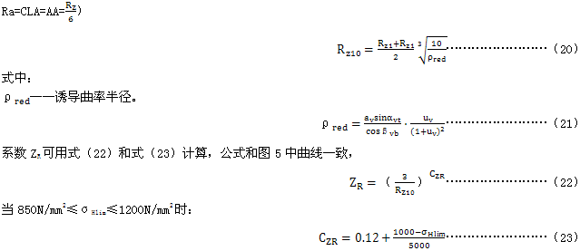 根據(jù)14.2的規(guī)定,粗糙度系數(shù)ZR是考慮齒面狀況對(duì)接觸疲勞(點(diǎn)蝕)強(qiáng)度的影響。圖5中的粗糙度系數(shù)曲線是Rz10和配對(duì)齒輪中較軟齒輪材料σHlim的函數(shù)。該圖對(duì)節(jié)點(diǎn)處誘導(dǎo)曲率半徑 的齒輪副是有效的。