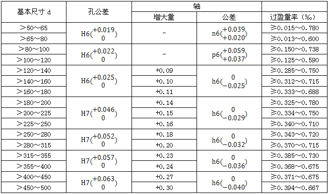 為了保證齒輪的傳動精度,和防止齒輪孔與軸之間可能因產(chǎn)生間隙,而導(dǎo)致腐蝕現(xiàn)象,所以當(dāng)齒輪及采用H6,H7公差帶,軸采用h6公差帶時,將軸的名義尺寸加一增大量,進(jìn)行輕熱配合,表1-146中所列的輕熱壓配合尺寸,僅適用于鍵聯(lián)結(jié)的情況下。