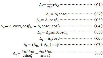 C2齒輪各項(xiàng)誤差應(yīng)按下述規(guī)定的方向計(jì)值:Δfpb、ΔFb、ΔFpX、Δffβ、ΔFw、ΔEwm、jn在齒面法線方向計(jì)值;ΔFi′、Δfi′、ΔFp、ΔFpk、Δfpt、ΔFβ、ΔFic′、Δfic′、jt在分度圓切線方向計(jì)值;Δff在基圓切線方向計(jì)值;ΔFr、ΔFi″、Δfi″、ΔEα″和ΔEH在雙側(cè)齒面徑向計(jì)值;ΔEs在雙側(cè)齒面分度圓螺旋線的法線方向計(jì)值。
