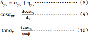砧的尺寸應(yīng)選擇得使其在齒槽中大致在分度圓的位置接觸齒面,棱柱的半角δyt可以用下面的近似方法來(lái)確定,此處δyt、ayt和ηyt為在測(cè)量圓上接觸的各角(見(jiàn)圖8)。