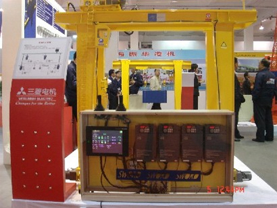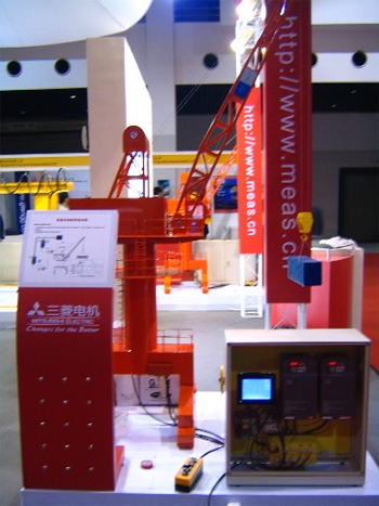 在2008年4月舉行的“第二屆中國(guó)(上海)國(guó)際起重機(jī)械及配件展覽會(huì)”上,三菱電機(jī)首次向眾人展示了起重行業(yè)的綜合解決方案。6套色彩鮮艷并按真實(shí)起重機(jī)等比縮小的模型,演示著6項(xiàng)各不相同的控制功能,吸引了觀眾的目光。功能簡(jiǎn)介如下: