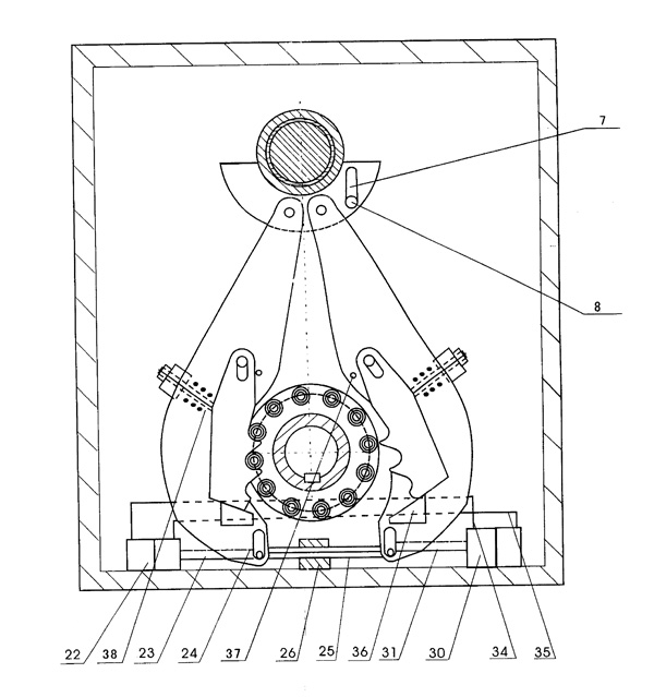 | 一種減速機(jī),其特征是輸入軸是偏心軸(2),偏心軸(2)中間偏心外圓上設(shè)置3-12個(gè)外套(32),每個(gè)外套(32)上分別連接連桿(27)位于殼體(1)內(nèi)一側(cè),每個(gè)連桿(27)連接能與滾輪(13)邊緣上的滾子輪(10)嚙合的鉤齒板(16);在工作時(shí)至少有1個(gè)鉤齒板(16)和對應(yīng)滾輪(13)邊緣上的滾子輪(10)嚙合,每個(gè)滾輪(13)邊緣上裝有5-80個(gè)滾子輪(10),上述所述的連桿(27)上裝有與滾輪(13)邊緣上的滾子輪(10)嚙合的鉤齒板(16)與對應(yīng)的3-12個(gè)滾輪(13)分別固定在輸出軸(12)上,且兩個(gè)相鄰滾輪邊緣上的滾子輪(10)在橫向排列上相位差是一個(gè)等值弧度,在連桿(27)上設(shè)置有定位槽(24),固定銷(21)設(shè)置在連桿(27)定位槽(24)內(nèi)位于殼體(1)內(nèi),鉤齒板(16)背面設(shè)置有彈性復(fù)位裝置。 |