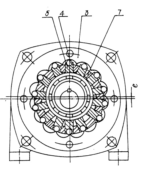 | 一種適用于機(jī)械傳動(dòng)裝置的內(nèi)齒減速機(jī),包括由輸入軸(1)聯(lián)接的偏心機(jī)構(gòu)及驅(qū)動(dòng)圈(7),固齒圈(3)等部分組成,其特征在于沿驅(qū)動(dòng)圈(7)外圓徑向開(kāi)設(shè)有等分導(dǎo)槽,并與驅(qū)動(dòng)圈(7)的內(nèi)環(huán)槽相通,在每個(gè)等分導(dǎo)槽的兩邊裝有擋塊(6),使之形成四周封閉的槽孔,在槽孔內(nèi)裝有滑桿(5),滑桿(5)的一端呈R形面,并裝有滾動(dòng)體(4)在槽孔中作徑向滑動(dòng),同時(shí)滾動(dòng)體(4)與固齒圈(3)嚙合,滑桿(5)的另一端呈平面或弧面,接觸于偏心機(jī)構(gòu)中的雙偏心凸輪(2)的軸承外圈上,在雙偏心凸輪(2)上裝有與滑桿(5)嚙合的滾動(dòng)軸承(10)。 |