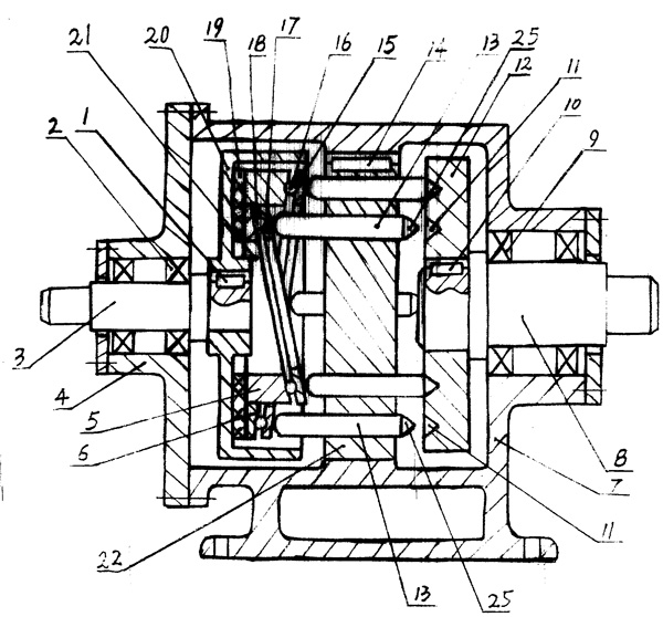 一種錐齒減速機(jī),它主要由軸承(2)支承于端蓋(4)的輸入軸(3),由鍵(14)連接于機(jī)殼(7)內(nèi)壁的錐齒盤(pán)(22)、由軸承(9)支承于機(jī)殼(7)的輸出軸(8)構(gòu)成,位于機(jī)殼(7)內(nèi)的輸入軸(3)的端部由鍵(1)連接有推壓盤(pán)(20),位于機(jī)殼(7)內(nèi)的輸出軸(8)的端部由鍵(10)連接有錐孔盤(pán)(12),其特征在于推壓盤(pán)(20)的凹腔(21)內(nèi)相對(duì)裝置有兩個(gè)分別配有一組滾子(16,18)、間隔環(huán)(15,17)的軸向斜盤(pán)激波器(6,5),在錐齒盤(pán)(22)上分別與兩個(gè)軸向斜盤(pán)激波器(5,6)相對(duì)應(yīng)的兩個(gè)同心圓周上均布的通孔(23)內(nèi)插有端部呈圓錐體形(25)的錐齒(13),錐孔盤(pán)(12)上相對(duì)應(yīng)的圓周上均布有與錐齒(13)端部的圓錐體形(25)相適應(yīng)的錐孔(11)。