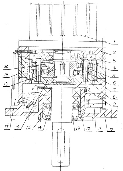 | 一種釜用不泄漏減速機(jī),由擺線輪[8]、輸入軸[18]、偏心軸承[20]、機(jī)座[10]、針齒輪及W輸出機(jī)構(gòu)組成,其中針齒輪由針齒殼[19],均布在針齒殼上的針齒[7]構(gòu)成,W機(jī)構(gòu)由輸出軸[16]與均布在輸出軸圓盤上的柱銷[6]及柱套[5]構(gòu)成,其特征在于: a)機(jī)座[10]內(nèi)有一儲(chǔ)油腔,機(jī)座外壁有一油泵[17]用來將儲(chǔ)油腔的潤滑油泵至減速機(jī)頂端由上而下對(duì)機(jī)件進(jìn)行潤滑; b)在輸出軸支承軸承[12]頂端有一圓環(huán)蓋[9],其高度高于儲(chǔ)油面1~3cm,用以防止從沿輸出軸漏油; c)在輸出軸軸承[12]下端有一個(gè)密封組件,它由套筒[15]及裝在套筒內(nèi)的密封[13]、[14]構(gòu)成,二密封之間要有一定空間,密封組件用以防止有毒介質(zhì)從反應(yīng)釜中泄漏到減速機(jī)內(nèi)腔。 |