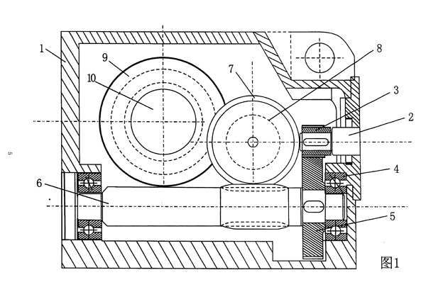 | 大速比減速機(jī),包括外殼、輸入軸、蝸輪、蝸桿、軸承與輸出軸,是單級(jí)傳動(dòng)結(jié)構(gòu),其特征是在輸入軸(2)上安裝有主動(dòng)齒輪(3)與被動(dòng)齒輪(5)嚙合,被動(dòng)齒輪(5)安裝在蝸桿(6)端部構(gòu)成一級(jí)傳動(dòng)結(jié)構(gòu);蝸桿(6)與蝸輪(7)嚙合,構(gòu)成二級(jí)傳動(dòng)結(jié)構(gòu);在蝸輪(7)軸上還安裝有齒輪(8)與輸出大齒輪(9)嚙合,輸出大齒輪(9)安裝在輸出軸(10)上,構(gòu)成三級(jí)傳動(dòng)結(jié)構(gòu)。 |