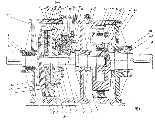 | 一種軟啟動減速機,在其機殼(1)及端蓋的軸承座中裝有輸入軸(14)、輸出軸(46)、其間裝有減速齒輪組,其特征在于: 輸入軸(14)連接一組摩擦片離合器,該離合器主要由裝在軸壓盤(11)與壓爪盤(8)之間的壓盤(9)和摩擦片組(12)構成,該軸壓盤(11)、壓盤(9)及壓爪盤(8)以螺釘(17)連接為一體,該壓盤(9)與軸壓盤(11)之間裝有分離彈簧(10);該摩擦片組(12)至少包括兩片外片(121)及夾持于外片之間的內片(122),該內片中心固接一花鍵套(123); 在摩擦片離合器與減速齒輪組之間以一花鍵軸(4)連接,該花鍵軸(4)的花鍵端連接花鍵套(123),另端以鍵連接齒輪(42),其中部由機體(1)的中間軸承座(35)支承;在摩擦片離合器的壓爪盤(8)的外側面上裝有軟啟動器(3),其構造為:在壓爪盤(8)上鉸接有等分圓周的至少二組壓爪(7),該壓爪的內臂(701)接觸壓盤(9),該壓爪(7)的外臂(702)接觸離心塊(6)的頂端,該離心塊(6)裝在壓爪盤(8)的徑向滑槽(801)中,該離心塊(6)鉸接于連桿(5),該連桿(5)傾斜鉸接調速齒輪(19),該調速齒輪(19)固裝在壓爪盤(8)的空心軸套(802)上;該調速齒輪(19)連接時間調節(jié)器(18); 至少二組時間調節(jié)器(18),其數(shù)量與壓爪(7)的數(shù)量相同,各安裝在軟啟動器(3)相鄰兩壓爪(7)之間的壓爪盤(8)上,每一時間調節(jié)器(18)的構造為:在時間調節(jié)器外殼(48)中平行地安裝有螺桿式軸齒輪(21)和軸齒輪(22),該螺桿式軸齒輪(21)螺接套裝有一內螺紋式齒條(20)而可軸向移動,該內螺紋式齒條(20)與調速齒輪(19)嚙合,該螺桿式軸齒輪(21)與軸齒輪(22)的同軸齒輪(23)嚙合,該軸齒輪(22)與齒條式空氣缸(24)的齒條嚙合,該齒條式空氣缸(24)的內螺紋端與導向桿(26)的外螺紋端涂密封膠螺接,該導向桿(26)外圓套裝彈簧(27),該齒條式空氣缸(24)內孔中裝有柱塞(25),該柱塞(25)另端固定于機殼(1),該齒條式空氣缸(24)徑向移動與套裝于其內部的柱塞(25)之間形成氣室,該氣室經(jīng)柱塞(25)、節(jié)流閥(29)、空氣過濾器(32)與外界空氣相通;該柱塞(25)上端受套裝在導向桿(26)外圓上的彈簧的壓力,該齒條式空氣缸(24)側面插入開鎖銷(28)的頭部,該開鎖銷(28)中部以銷軸(47)鉸接于開鎖銷(28),其尾 |