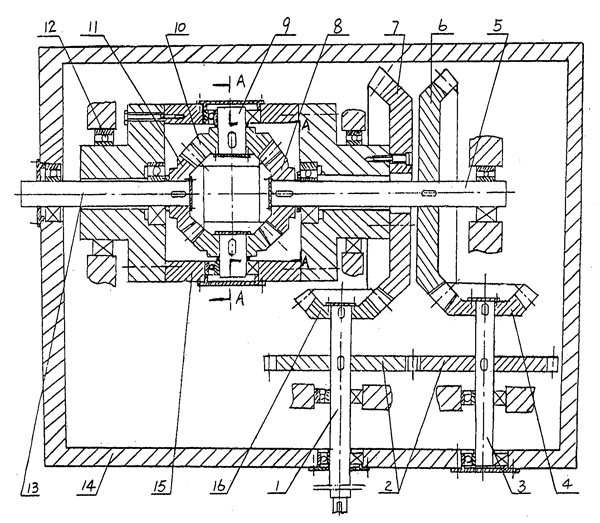 | 一種差動齒輪減速機,具有大箱體(14)和軸承(12),以及支承在大箱體(14)上的輸入軸(1)和輸出軸(13),其特征在于: a、輸入軸(1)上固定連接有第一主動齒輪(16)和傳動齒輪(2); b、大箱體(14)內(nèi)還支承有中間傳動軸(3),該中間傳動軸(3)上固定連接有第二主動齒輪(4)以及與輸入軸(1)上的傳動齒輪(2)相嚙合的傳動齒輪(2); c、大箱體(14)內(nèi)還支承有速比差動齒輪軸(5),該速比差動齒輪軸(5)上固定連接有與第二主動齒輪(4)相嚙合的速比差動齒輪(6); d、大箱體(14)內(nèi)還具有可旋轉(zhuǎn)地支承在軸承(12)上的小箱體(15),小箱體(15)的一側(cè)固定連接有與第一主動齒輪(16)嚙合的速比定齒輪(7),并支承有速比差動齒輪軸(5),另一側(cè)支承有輸出軸(13),在小箱體(15)內(nèi),速比差動齒輪軸(5)的軸端裝連有速比差動齒輪軸齒輪(8),輸出軸(13)的軸端裝連有輸出齒輪(11); e、小箱體(15)內(nèi)還支承有二根或四根差動齒輪軸(9),每根差動齒輪軸(9)上都裝連有一只差動齒輪(10),差動齒輪(10)既與速比差動齒輪軸齒輪(8)嚙合,又與輸出齒輪(11)嚙合; f、速比定齒輪(7)有Z1個齒,速比差動齒輪(6)有Z2個齒,Z1和Z2相差1齒或數(shù)齒,第一主動齒輪(16)有Z3個齒,第二主動齒輪(4)有Z4個齒,Z3和Z4之比為1∶2。 |