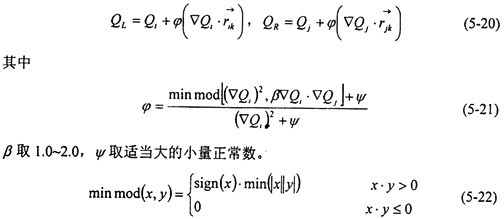 但是,由(5-18)直接得到的格式在激波附近是不穩(wěn)定的,將會出現(xiàn)非物理振蕩。迎風(fēng)格式通過限制物理量的梯度值,來保證物理量在單元內(nèi)的分布具有單調(diào)性,從而達到抑制間斷附近非物理振蕩的目的。這時,(5-18)式變?yōu)?/DIV>