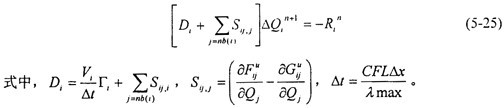 方程(5-24)可以采用顯式或隱式的方法進行求解。但是由于受時間步長的限制,采用顯式的R-K時間推進方法需要迭代的步數(shù)較多,計算很不經(jīng)濟,因此本文采用了Gauss-Seidel迭代隱式求解的方法。