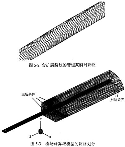 圖5-3是以圖5-2為依據(jù)建立的流場計算網(wǎng)格。設(shè)計參數(shù)為:裂紋擴展速度200m/s,管道外徑1016mm,壁厚14.7mm,內(nèi)壓10MPa。