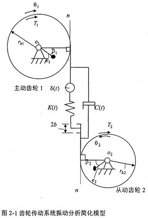 圖2-1中,rb1——主動(dòng)齒輪基圓半徑;rb2——從動(dòng)齒輪基圓半徑;K(t)——齒輪嚙合剛度;e1——主動(dòng)齒偏心距;e2——從動(dòng)齒輪偏心距;β1——主動(dòng)齒輪不平衡質(zhì)量的初始角度;β2——從動(dòng)齒輪不平衡質(zhì)量的初始角度;δ(t)——齒輪的綜合誤差;JD1——主動(dòng)齒輪轉(zhuǎn)動(dòng)慣量;JD2——從動(dòng)齒輪轉(zhuǎn)動(dòng)慣量;C(t)——齒輪阻尼系數(shù);b——具側(cè)間隙;n-n——齒輪嚙合線方向。