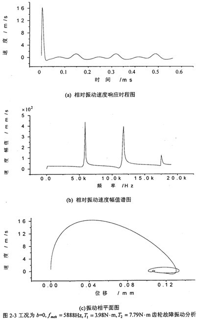 圖2-3是工況為:齒輪嚙合頻率為5888Hz、齒側(cè)間隙b=0齒輪故障振動(dòng)分析,其中(a)圖為齒輪輪齒相對振動(dòng)速度時(shí)程響應(yīng)圖,(b)圖為齒輪輪齒相對振動(dòng)速度幅值譜圖。從圖上可看出,當(dāng)齒側(cè)間隙為0時(shí),此時(shí)振動(dòng)故障頻率為齒輪嚙合頻率fmeh。的1、2、3倍。相平面圖也穩(wěn)定于一個(gè)橢園極限環(huán)(見(c)圖)。