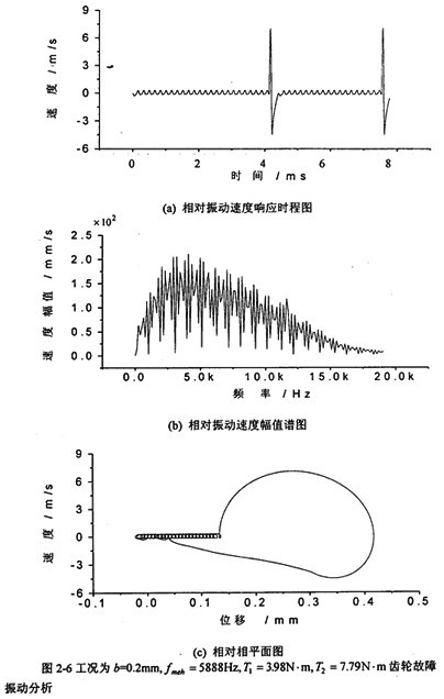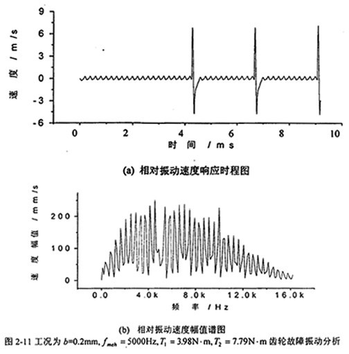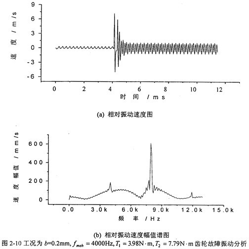 圖2-10中,(a)圖和(b)圖分別是當(dāng)齒輪嚙合頻率增加到4000Hz、齒側(cè)間隙增加到b=0.2mm時(shí)齒輪輪齒相對振動(dòng)速度時(shí)程響應(yīng)圖和齒輪輪齒相對振動(dòng)速度幅值譜圖。從(b)圖上可看出,此時(shí)振動(dòng)故障頻率仍為齒輪嚙合頻率fmeh的1、2、3倍,分?jǐn)?shù)諧波也不明顯,但2fmeh的幅值比1fmeh的大。
