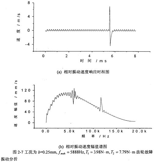 (齒厚)時(shí),齒輪輪齒相對振動(dòng)速度時(shí)程響應(yīng)圖((a)圖)和齒輪輪齒相對振動(dòng)速度幅值譜圖((b)圖)。從(b)圖上可看出,當(dāng)齒側(cè)間隙增加到0.25mm時(shí),此時(shí)振動(dòng)故障頻率成份又發(fā)生了改變,振動(dòng)故障頻率為齒輪嚙合頻率f