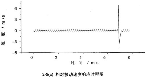 軸承對箱體動(dòng)態(tài)激勵(lì)力和齒傳輸線相對振動(dòng)位移X=(rb1tgθ1-rb2tgθ2)有相對振動(dòng)速度 (=rb1sec2θ1 1)有關(guān),文中只列出 的計(jì)算結(jié)果,圖2-3~圖2-13為各種工況的齒輪故障振動(dòng)分析,其中包括齒輪輪齒相對振動(dòng)速度時(shí)程響應(yīng)圖、齒輪輪齒相對振動(dòng)速度幅值譜圖和相平面圖。