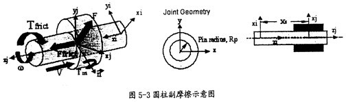 圓柱副產(chǎn)生摩擦的示意圖5-3所示。在這種動動副中會產(chǎn)生逆向于移動方V(如圖5-3中藍色箭頭所示)的摩擦力Ffrict(如圖5-3中紅色箭頭所示)及逆向于旋轉(zhuǎn)方向ω(如圖5-3中藍色箭頭所示)的摩擦扭矩Ffrict(如圖5-3中紅色箭頭所示),它的產(chǎn)生主要由兩種因素,即構(gòu)件間相互作用的徑向力F、構(gòu)件間相互作用的彎矩Tm(這兩種力如圖5-3中綠色箭頭所示)。在施加這些作用力產(chǎn)生的摩擦力時,要考慮徑向力F的大小、圓柱半徑RP(如圖5-3中間圖所示)、運動副間的重疊量和重疊量的變化情況、彎矩Tm的大小和彎矩的反作用臂長Xs(如圖5-2中右圖所示),另外還得考慮靜摩擦系數(shù)、動摩擦系數(shù)及預(yù)載荷的作用。
