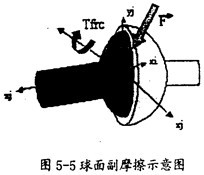 球面副產(chǎn)生摩擦的示意圖如圖5-5所示。在這種運動副中只會產(chǎn)生逆向于旋轉(zhuǎn)方向的摩擦扭矩Tfrc(如圖5-5中紅色箭頭所示),它的產(chǎn)生只有一種因素,即構(gòu)件間相互作用的徑向力F(如圖5-5中灰色箭頭所示)。在施加由相互作用的徑向力F產(chǎn)生的摩擦力時,要考慮徑向力F的大小和球半徑,另外還得考慮靜摩擦系數(shù)、動摩擦索數(shù)及預(yù)載荷的作用。