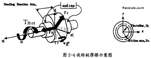 旋轉(zhuǎn)副產(chǎn)生摩擦的示意圖如圖5-4所示。在這種運動副中只會產(chǎn)生逆向于旋轉(zhuǎn)方向。(如圖5-4中藍色箭頭所示)的摩擦扭矩Tfrict(如圖5-4中紅色箭頭所示),它的產(chǎn)生主要由三種因素,即構(gòu)件間相互作用的徑向力Fr、構(gòu)件間相互作用的軸向力Fa、構(gòu)件間相互作用的彎矩Tr(這三種力如圖5-4中綠色箭頭所示)。在施加由這些作用力產(chǎn)生的摩擦力時,要考慮徑向力Fr的大小、圓柱半徑RP(如圖5-4右圖所示)、軸向力Fa的大小、摩擦半徑Rn的大小(如圖5-4右圖所示)、彎矩Tm的大小和彎矩的反作用臂長(即旋轉(zhuǎn)副的長度,如圖5-4中左圖所示),另外還得考慮靜摩擦系、動摩擦系數(shù)及預(yù)載荷的作用。