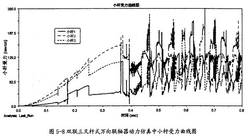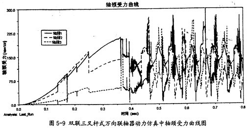由圖5-9可以看出,雙聯(lián)三叉桿式萬向聯(lián)軸器在動力仿真的過程中, 雙聯(lián)三叉桿一端的三軸頸同內(nèi)球頭的圓柱副上的作用力變化趨勢同圖5-8中的小桿變化趨勢是相同的。由于它們的受力變動復(fù)雜,故這三力在雙聯(lián)三叉桿一端上的向量和也可能不為0。這樣在雙聯(lián)三叉桿上也會產(chǎn)生附加彎矩的作用。而且軸頸受力平均較小桿的受力要大。