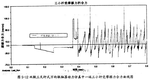 由圖5-11可以看出,雙取三叉桿式萬向聯(lián)軸器在動力仿真的過程中,其一端的三內(nèi)球頭同軸頸間的摩擦力變化相當(dāng)有規(guī)律。當(dāng)內(nèi)球頭相對軸頸運動反向時,綜們就會在正負間有規(guī)律的切換。但在這里產(chǎn)生摩擦力的平均大小要較小桿上的小得多。