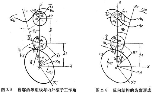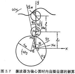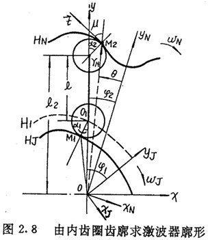 由上面可以看出,在選定激波器廓形TJ=TJ(θ)的情況下,正反兩種結(jié)構(gòu)所得到的內(nèi)齒圈齒廓方程式(2.21)與式(2.22)在形式上是不同的。對(duì)于反向結(jié)構(gòu),用-θ代換激波器方程中的θ,即令TJ=TJ(-θ),則θ增加的方向?yàn)轫槙r(shí)針方向,若激波器廓形可表示為偶函數(shù),即TJ(一θ)=TJ(θ),讓激波器按逆時(shí)針方向轉(zhuǎn)動(dòng),則所得的內(nèi)齒圈齒廓方程式完全與(2.21)式相同。因而齒廓方程式(2.22)與式(2.21)雖然形式不同,但實(shí)質(zhì)是一樣的。區(qū)別在于參數(shù)吸的取值方向,今后以式(2.21)作為內(nèi)齒圈齒廓的標(biāo)準(zhǔn)形式。