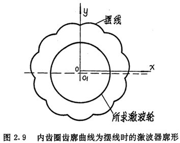 J上對(duì)應(yīng)點(diǎn)的坐標(biāo)值。一些點(diǎn)的計(jì)算數(shù)據(jù)如表2.2所示,由計(jì)算機(jī)繪出的激波器廓形如圖2.9所示,它并不是一個(gè)標(biāo)準(zhǔn)的圓,圖中圓的上部稍微有點(diǎn)凸出。由解的唯一性可推知,激波器為偏心圓的推桿減速器,其內(nèi)齒圈廓形一定不是擺線,雖然形狀相似,其實(shí)二者是不同的,這已為工程實(shí)際所證實(shí)。