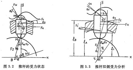 當(dāng)FJ、FN二力的交點(diǎn)Q落在傳動(dòng)圈所在環(huán)內(nèi)(圖3.2所示),推桿呈現(xiàn)單側(cè)受力狀態(tài)(右側(cè)受力),對推桿質(zhì)心取矩,可得如下平衡方程式: